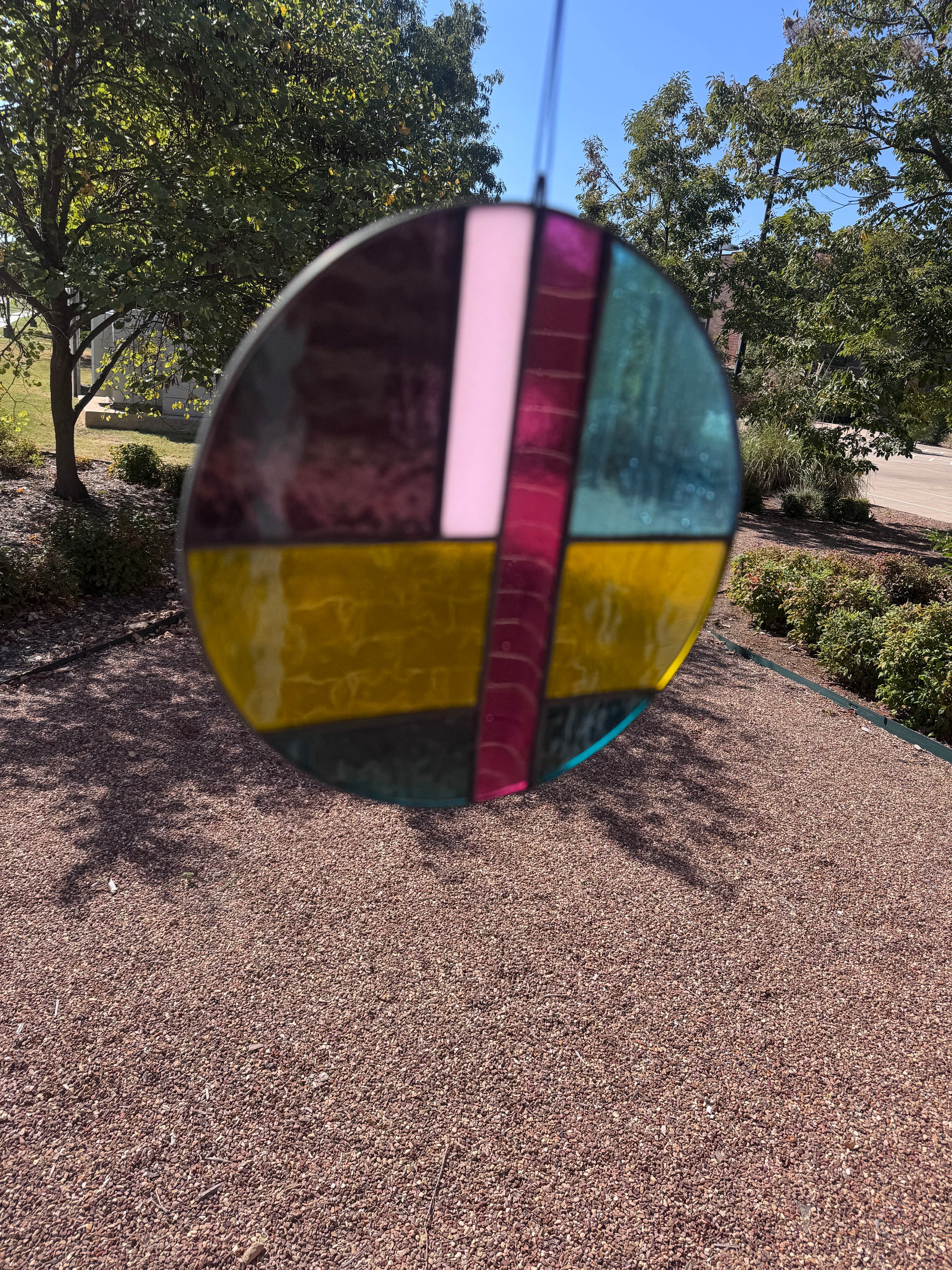 Crafted using the traditional Tiffany-style stained glass method, each section of glass is carefully selected, hand-cut, and assembled, then finished with a lead came surround for a classic, refined edge. When hung in a bright window, Prism Shadow casts vibrant, overlapping color shapes that shift throughout the day—turning light itself into part of the artwork.