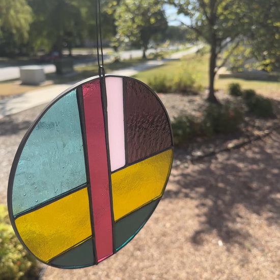 Prism Shadow celebrates the beauty of color and light in motion. Designed with a bold, geometric composition, this stained glass suncatcher blends teal, golden amber, plum, blush, and deep berry tones that glow beautifully when sunlight passes through.